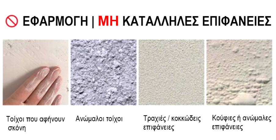 Η επιφάνεια πρέπει να είναι λεία, καθαρή και σταθερή. Δεν εφαρμόζονται σε ανώμαλες, σκονισμένες ή πορώδεις επιφάνειες, όπως: