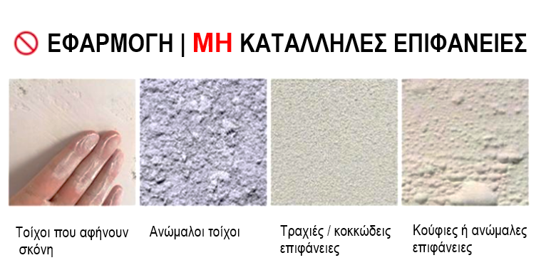 Εφαρμόζεται σε κάθε επιφάνεια, ανεξαρτήτως υλικού (τσιμεντοειδή, ξύλο κλπ). Είναι σημαντικό η επιφάνεια που θα εφαρμοστεί να είναι καθαρή, λεία και ευθυγραμμισμένη (απολύτως επίπεδη).